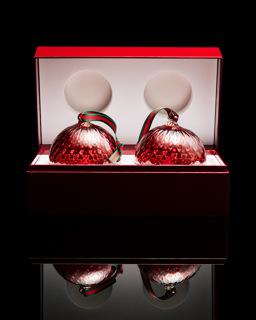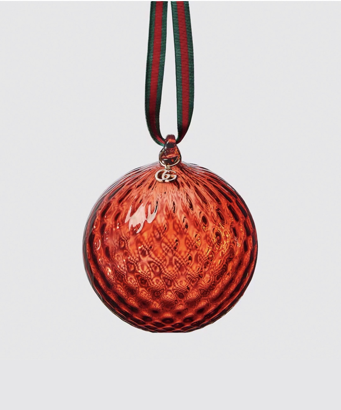 These festive decorations are expertly crafted using the traditional mouth-blown Murano glass technique and the balloton technique, which creates a distinctive texture. The transparent red glass of the baubles is elegantly paired with Gucci’s archival Web stripe in green and red, featuring a ribbon loop detail for an added touch of luxury. This collaboration beautifully combines the craftsmanship of Murano glass with Gucci’s iconic design, making it a perfect and stylish holiday gift.