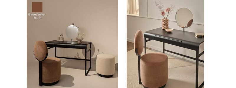 The Beauty Armchair from Saba Italia is part of the New Collection 2024, inspired by the gentle gesture of applying make-up, showcasing a feminine and ironic design. Created to complement a dressing table, this armchair is perfectly sized—compact and space-saving, making it ideal for any home. Notably, it features the Mocha Mousse color, offering a visually soothing and warm aesthetic while exuding elegance and luxury.