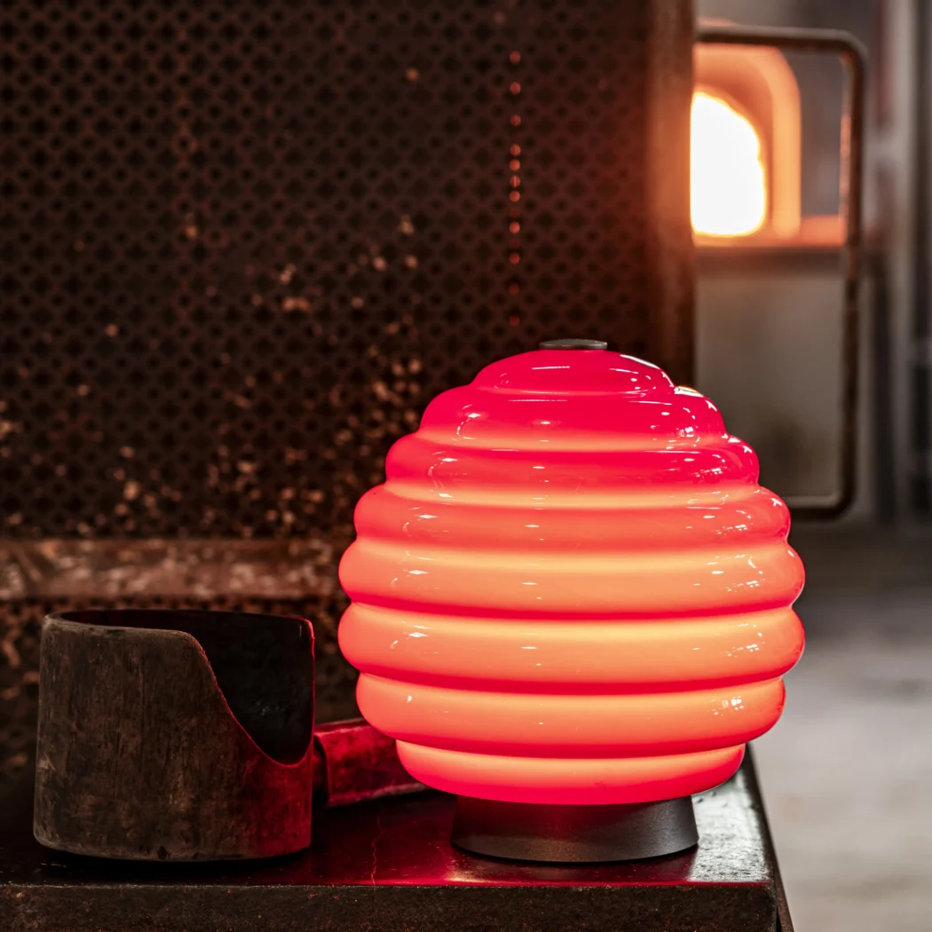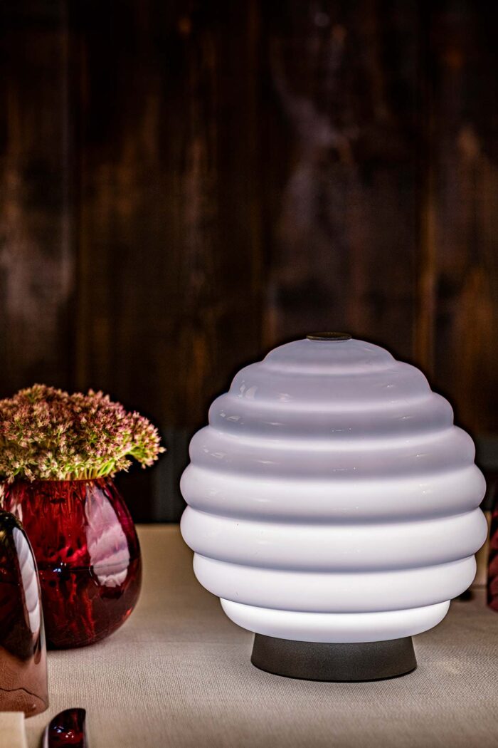 The historic vase designed in 1930 by Napoleone Martinuzzi is renewed and transformed into a rechargeable battery-powered table lamp, combining the elegance of the past with the convenience of the present. This captivating lamp turns a historic glass vase into a unique light source. With a timeless design, Deco enchants with its intrinsic beauty. Every detail, from the fluid and concentric lines, tells a story of bygone eras. However, the real magic begins when this artwork comes to life as a lamp.
