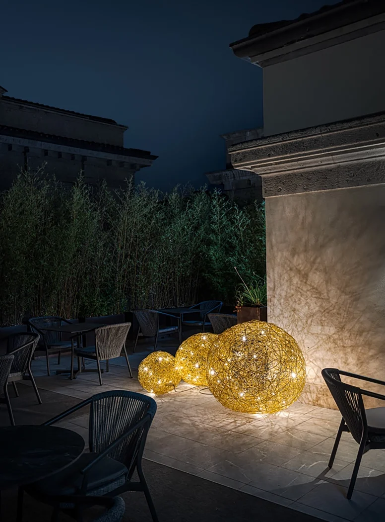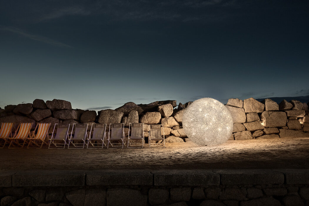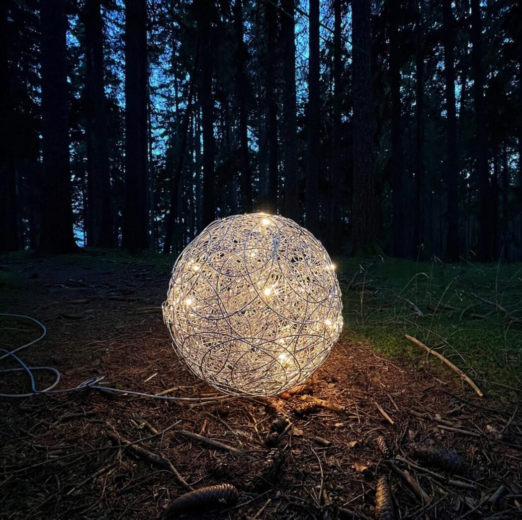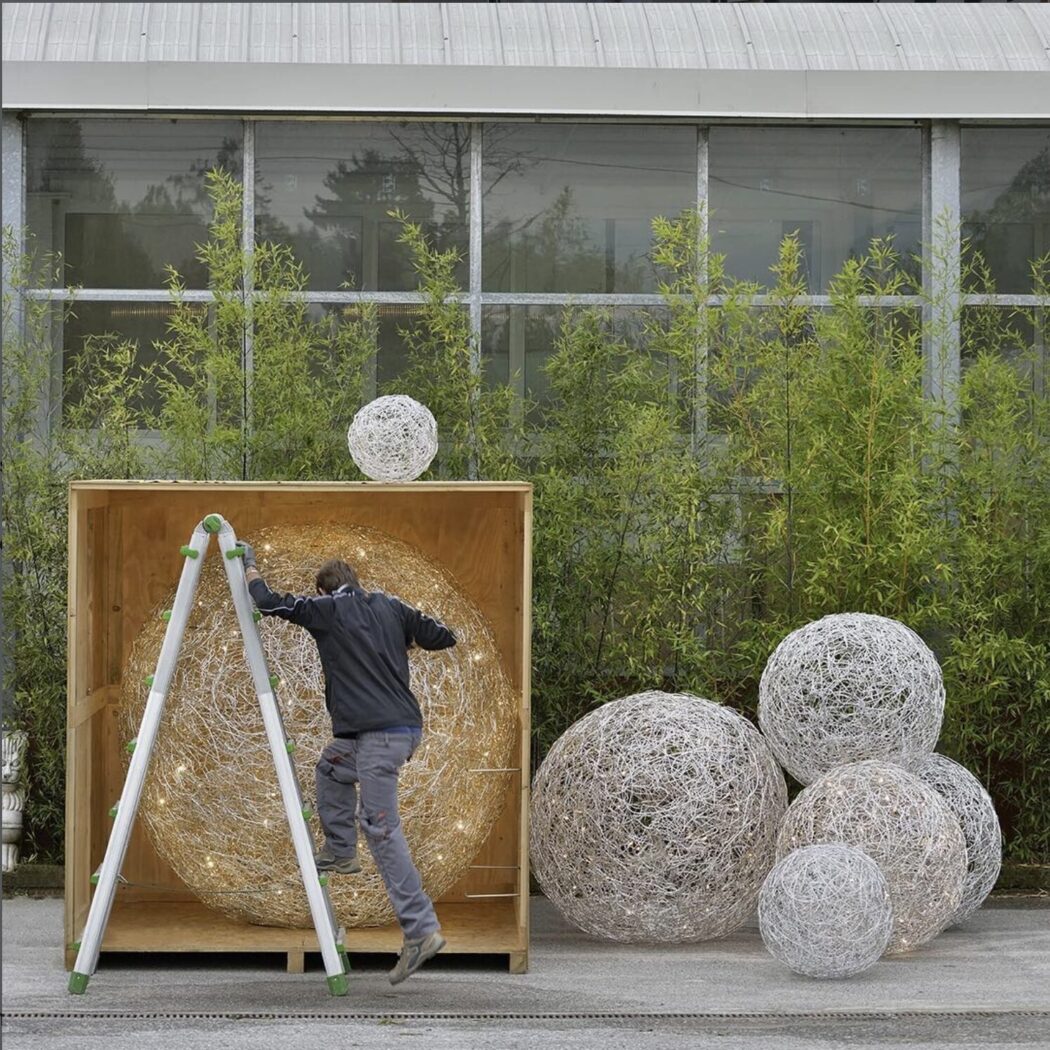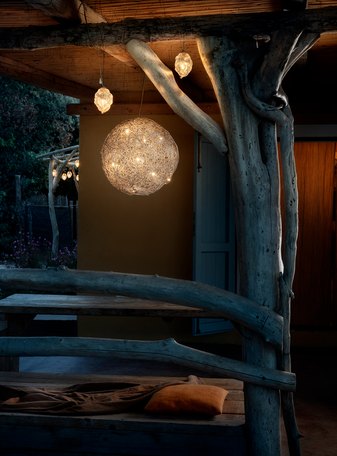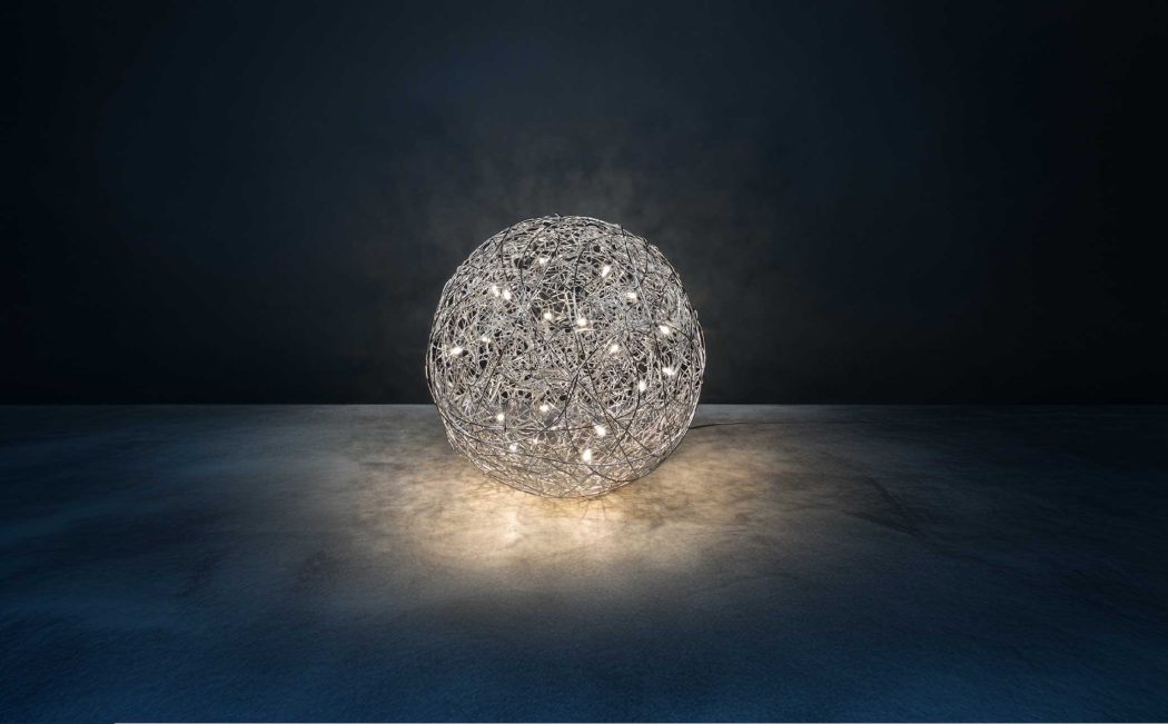 Fil de Fer is a lighting fixture made of shaped, woven aluminium wire, which is lit on the inside by tiny bulbs. Designed and made by Enzo Catellani,