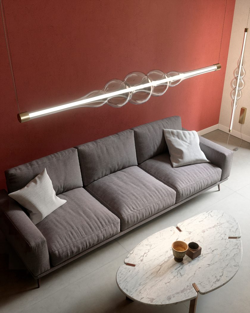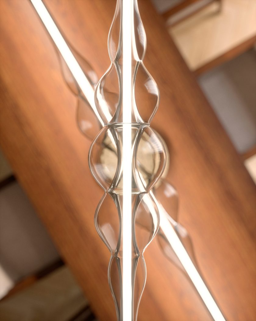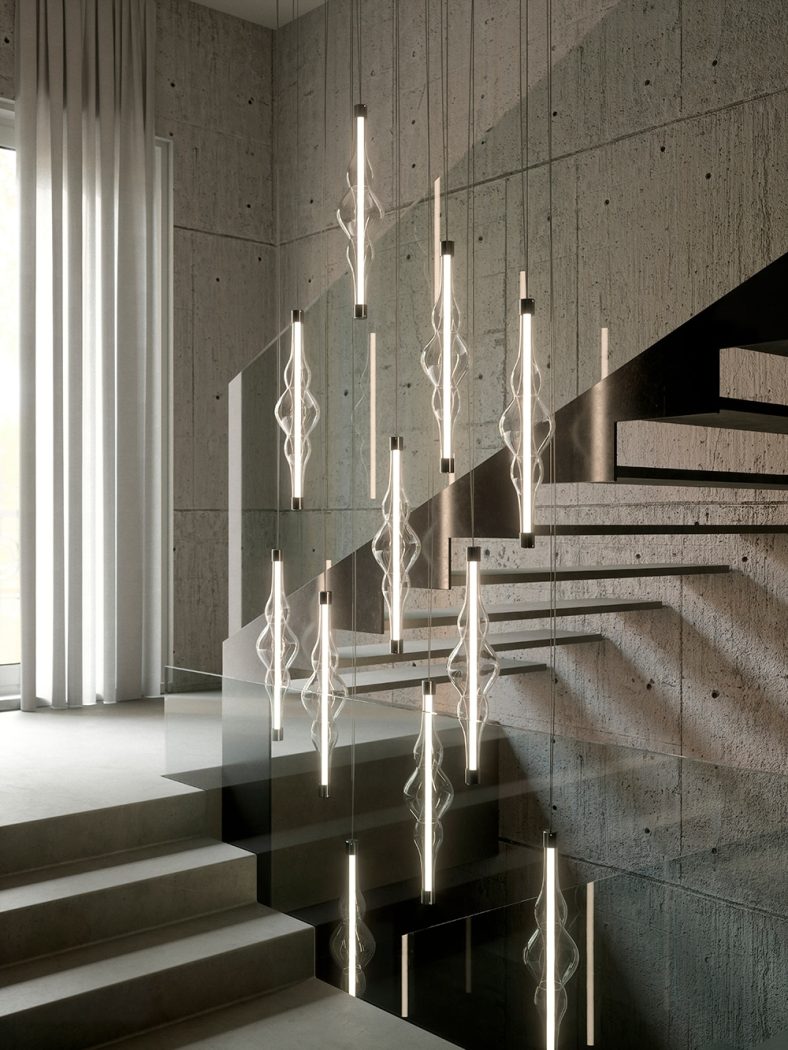 “Frequency was born from the desire to enhance the essence of light. I imagined a beam of light that traveled through space. I wanted the shape of the glass to tell the movement and intensity of the energy released by this beam. Through a skilful control of the glass, thanks to the experience of Cangini and Tucci, we managed to create a sculptural object with a definite character but at the same time fluid and light, an object in which the shapes seem to interpenetrate, in which the volumes slide into each other as in a wave of living and active energy. Frequency is a contemporary lamp that celebrates the art of handmade glass as only a sculpture can do”. Marcantonio