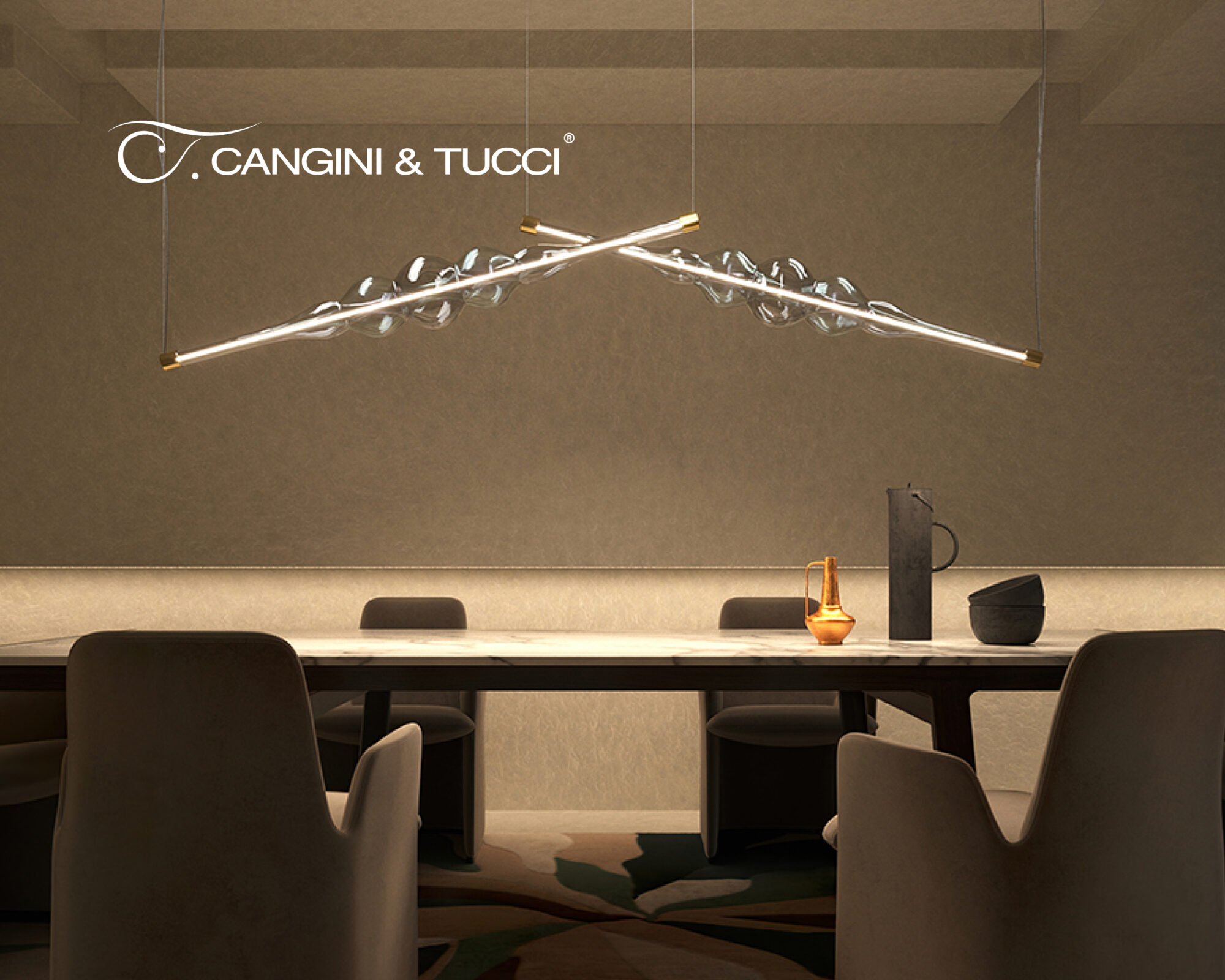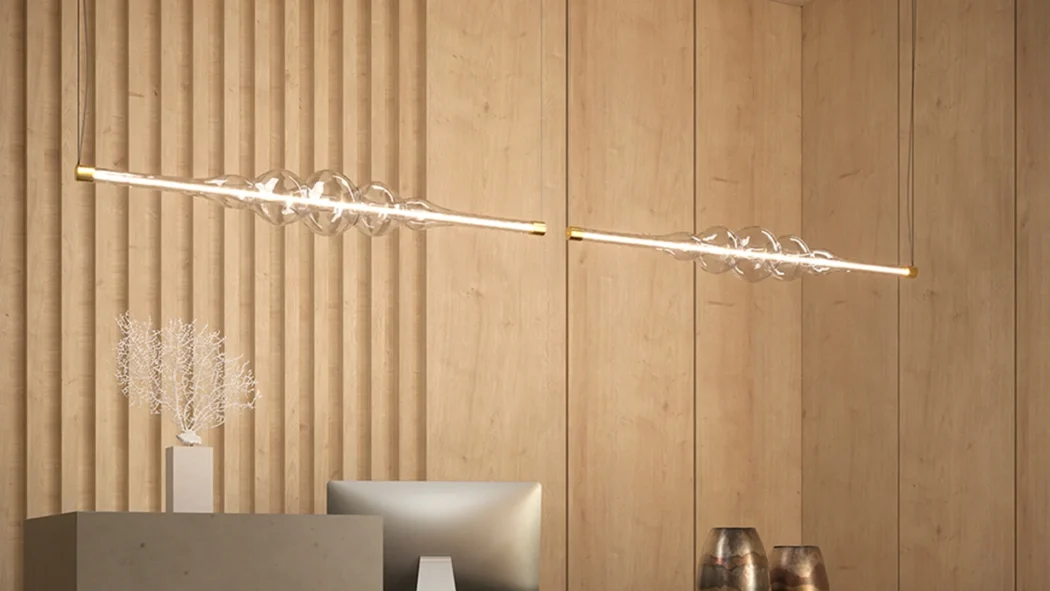 Frequency is a linear LED lamp made of blown glass and designed by Marcantonio. Frequency exists in two versions, both hanging. The first can be installed horizontally, over a dining table, above a reception desk or a desk in an office. The second is installed vertically and works like a floor lamp, but without any obstacle on the ground, since it does not have a base. Frequency, like all Cangini and Tucci lamps, is entirely handmade in Italy.