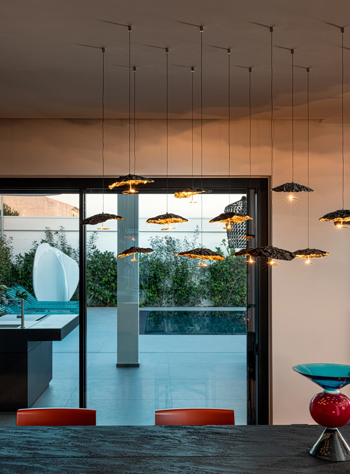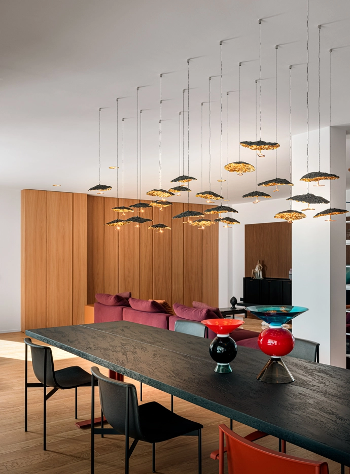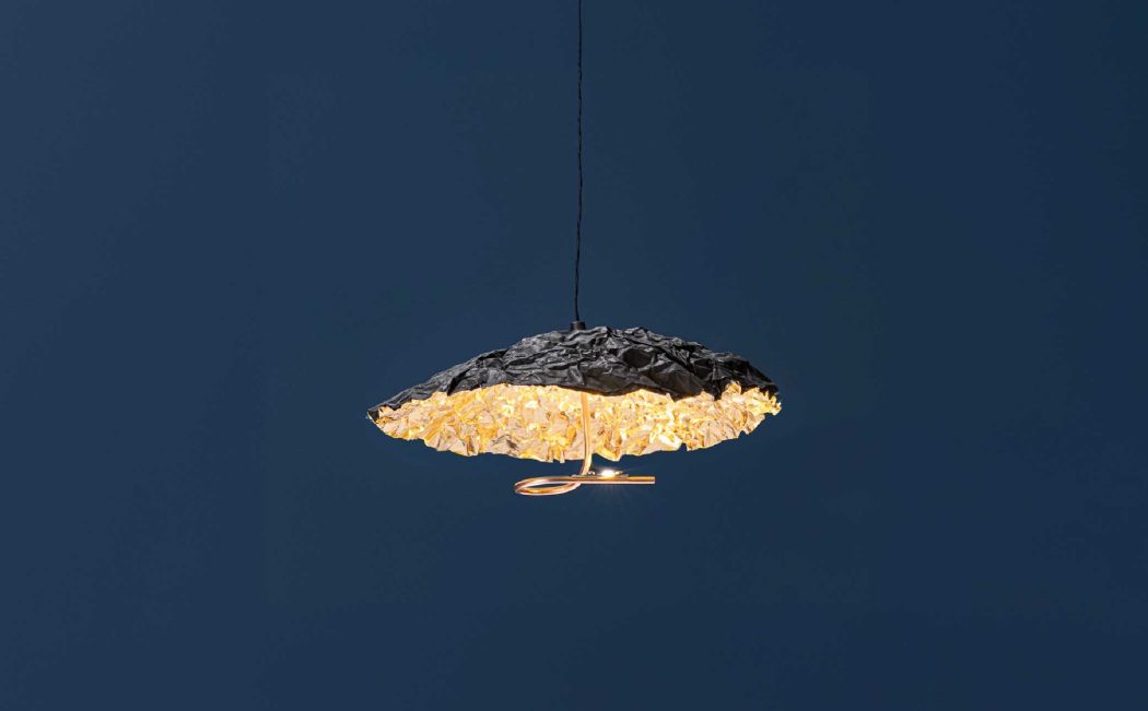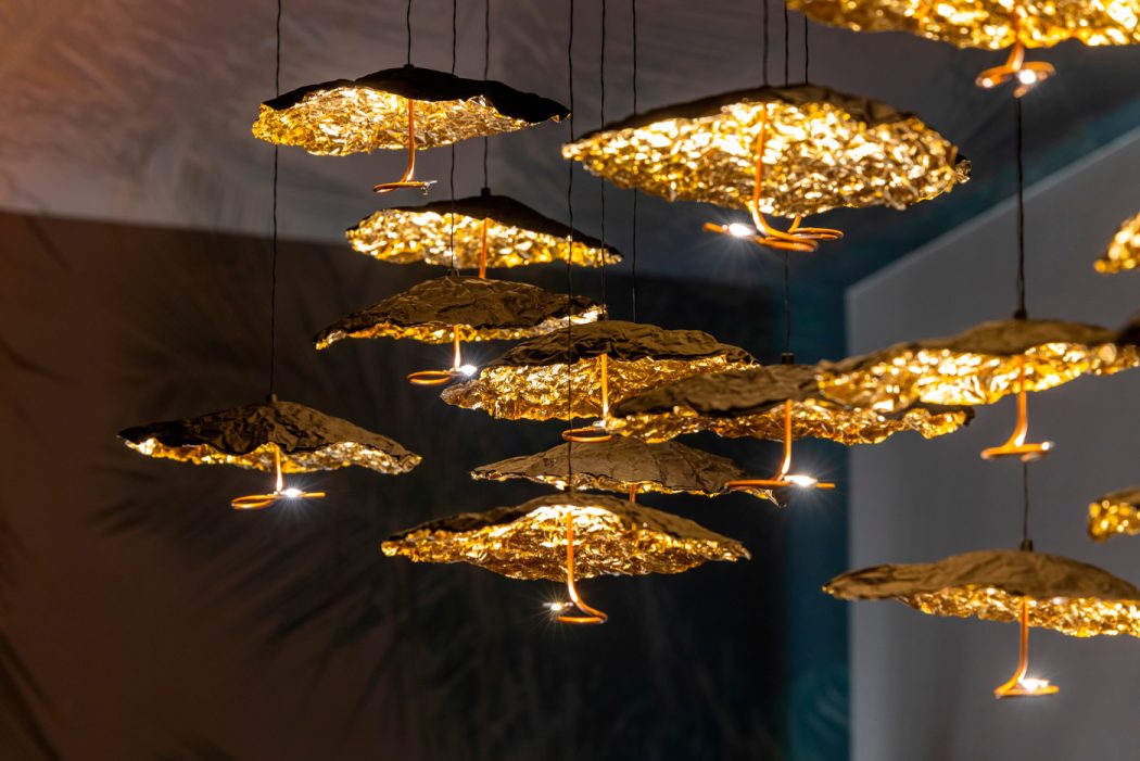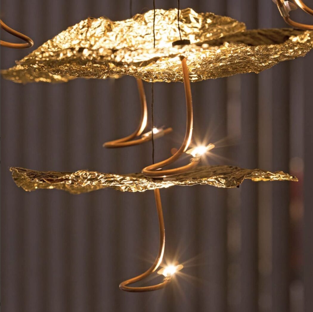 Gold Moon Chandelier brings a distinctive new twist to the traditional chandelier concept, turning it into a striking cascade of suspended light. It can be created in a variety of models, with different bases, finishes and numbers of elements, and is composed of a series of discs with irregular shapes, suspended from which are slender cables of different heights ending in beautiful copper curls cradling small LED lights. The internal surface of the discs, covered by hand in gold leaf, engages with the light emitted by the LEDs, amplifying it and creating an alluring ambience.