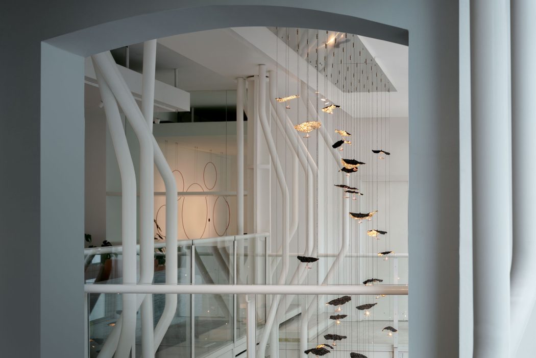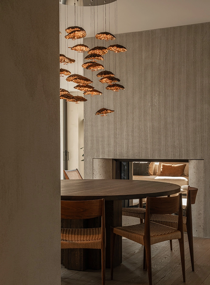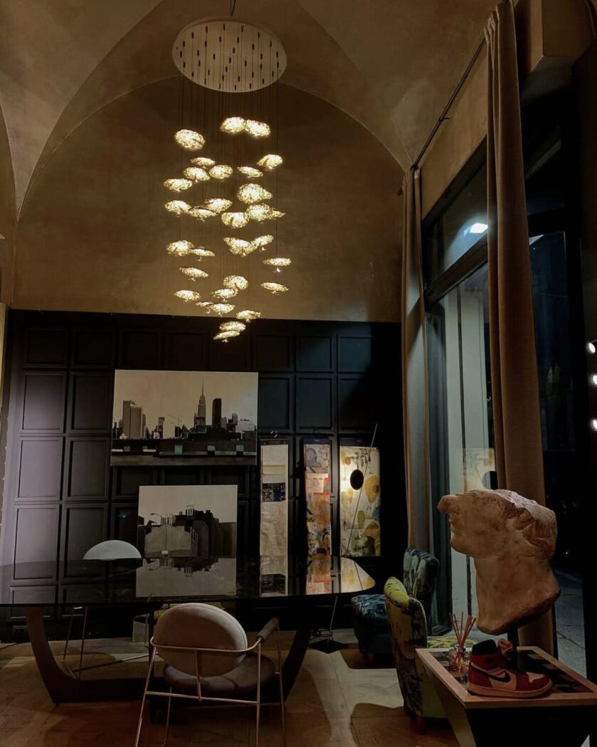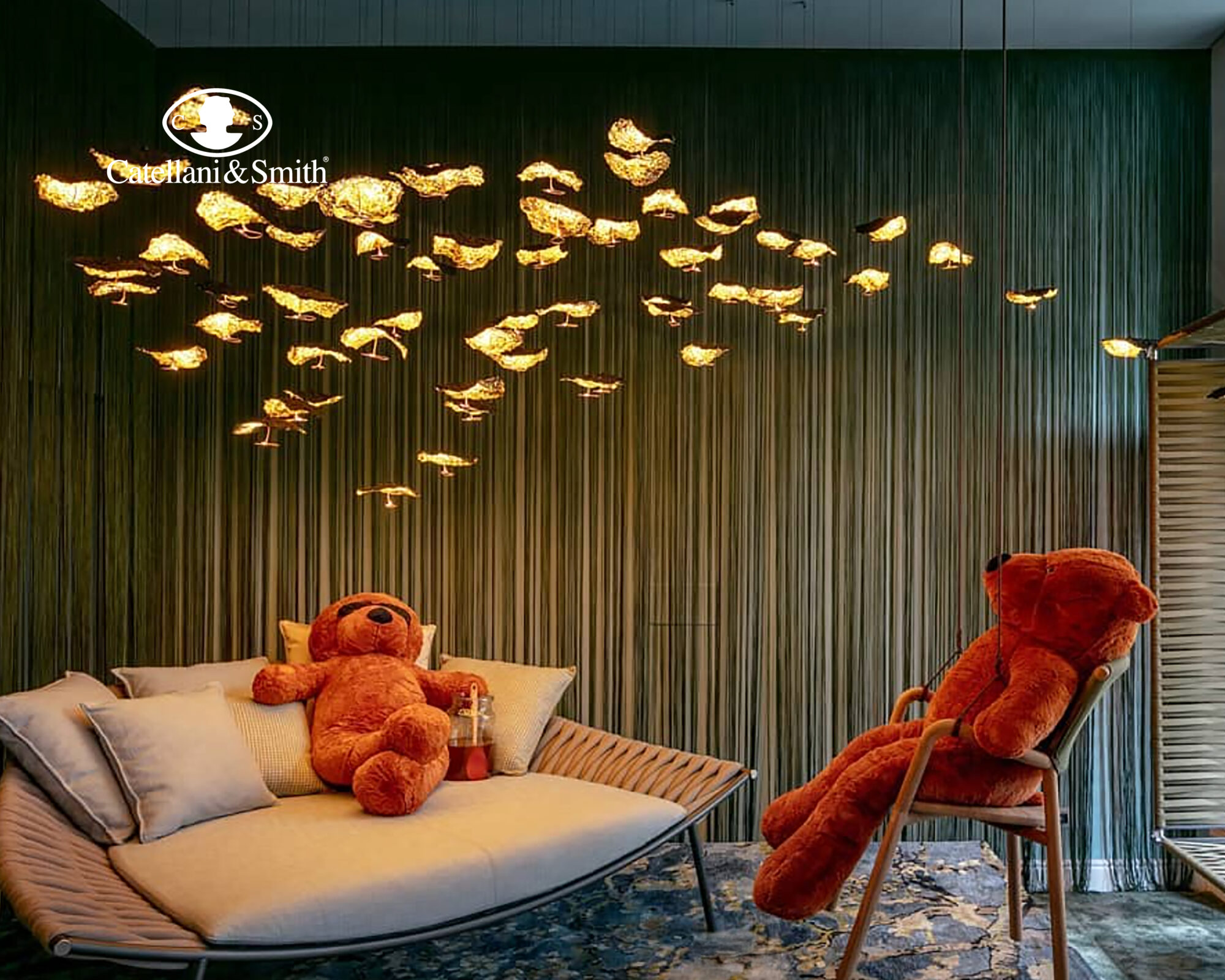 Gold Moon Chandelier brings a distinctive new twist to the traditional chandelier concept, turning it into a striking cascade of suspended light. It can be created in a variety of models, with different bases, finishes and numbers of elements, and is composed of a series of discs with irregular shapes, suspended from which are slender cables of different heights ending in beautiful copper curls cradling small LED lights. The internal surface of the discs, covered by hand in gold leaf, engages with the light emitted by the LEDs, amplifying it and creating an alluring ambience.