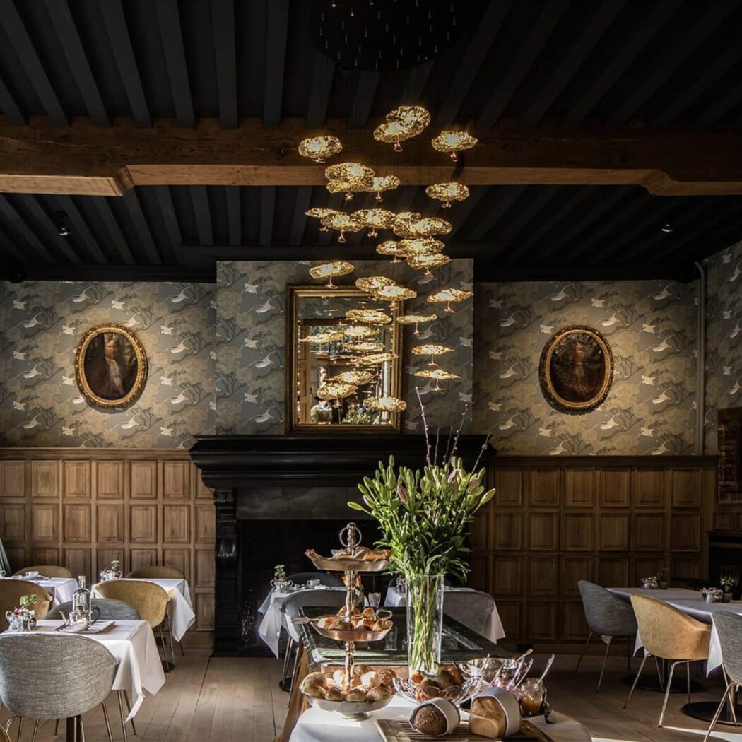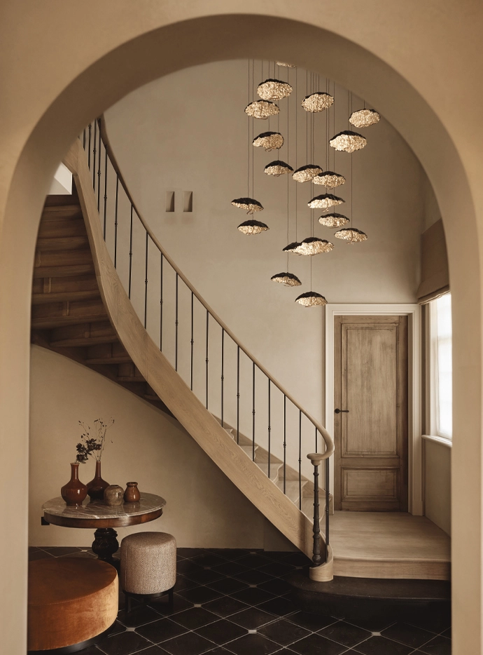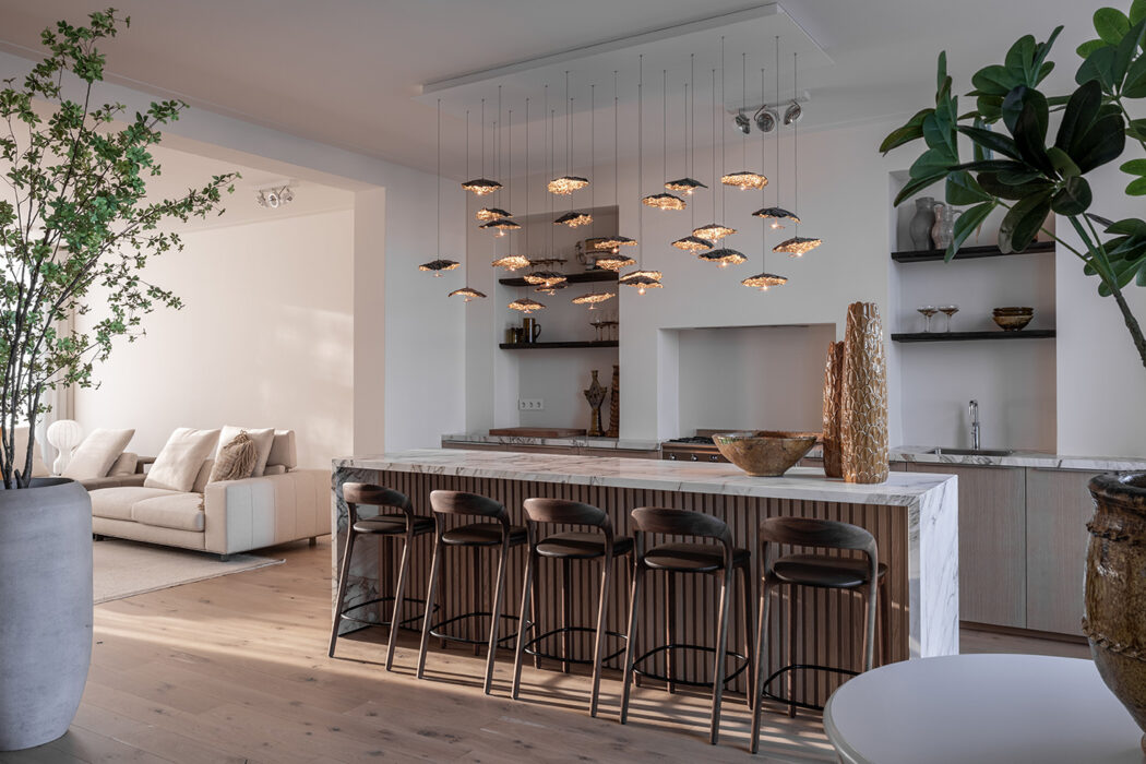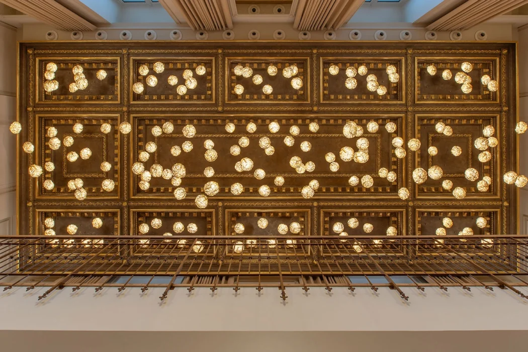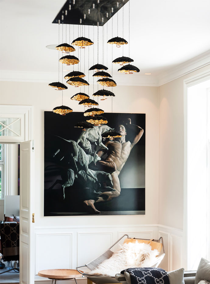 Gold Moon Chandelier brings a distinctive new twist to the traditional chandelier concept, turning it into a striking cascade of suspended light.