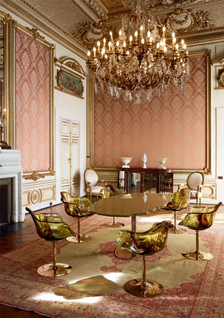 The glass top of the Egeo table captures and reflects light, much like sunlight dancing on the ocean surface, enhancing its surroundings and making it a focal point of any room. It is offered in multiple dimensions to suit different spaces, from intimate residential settings to larger commercial venues.