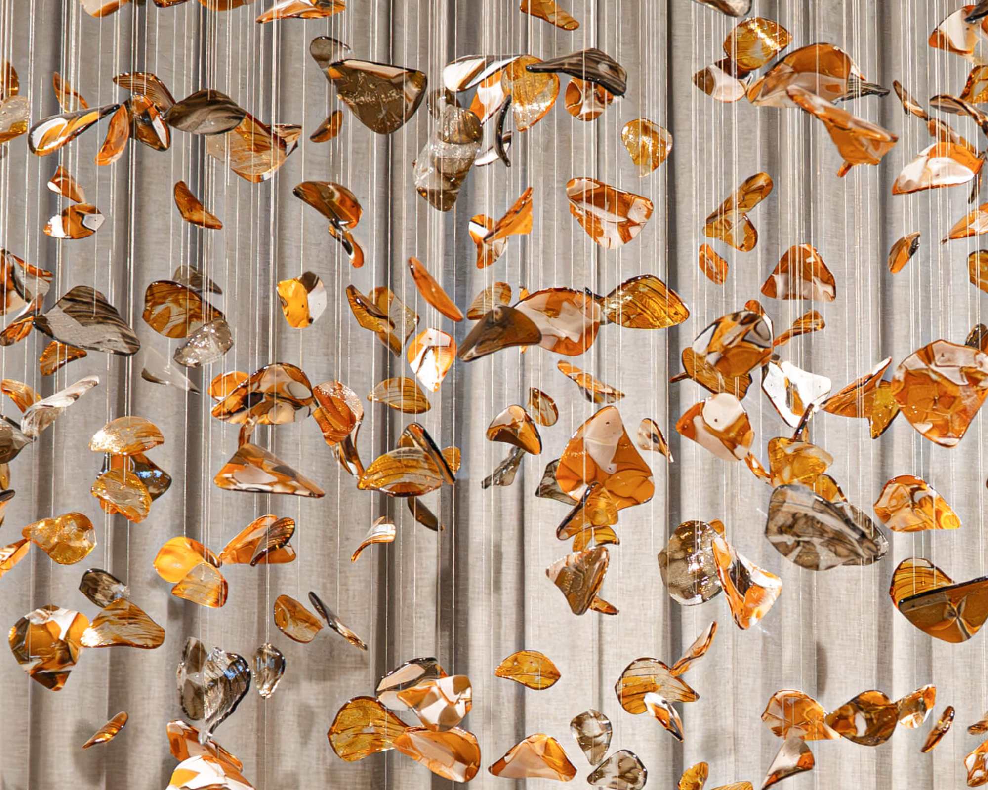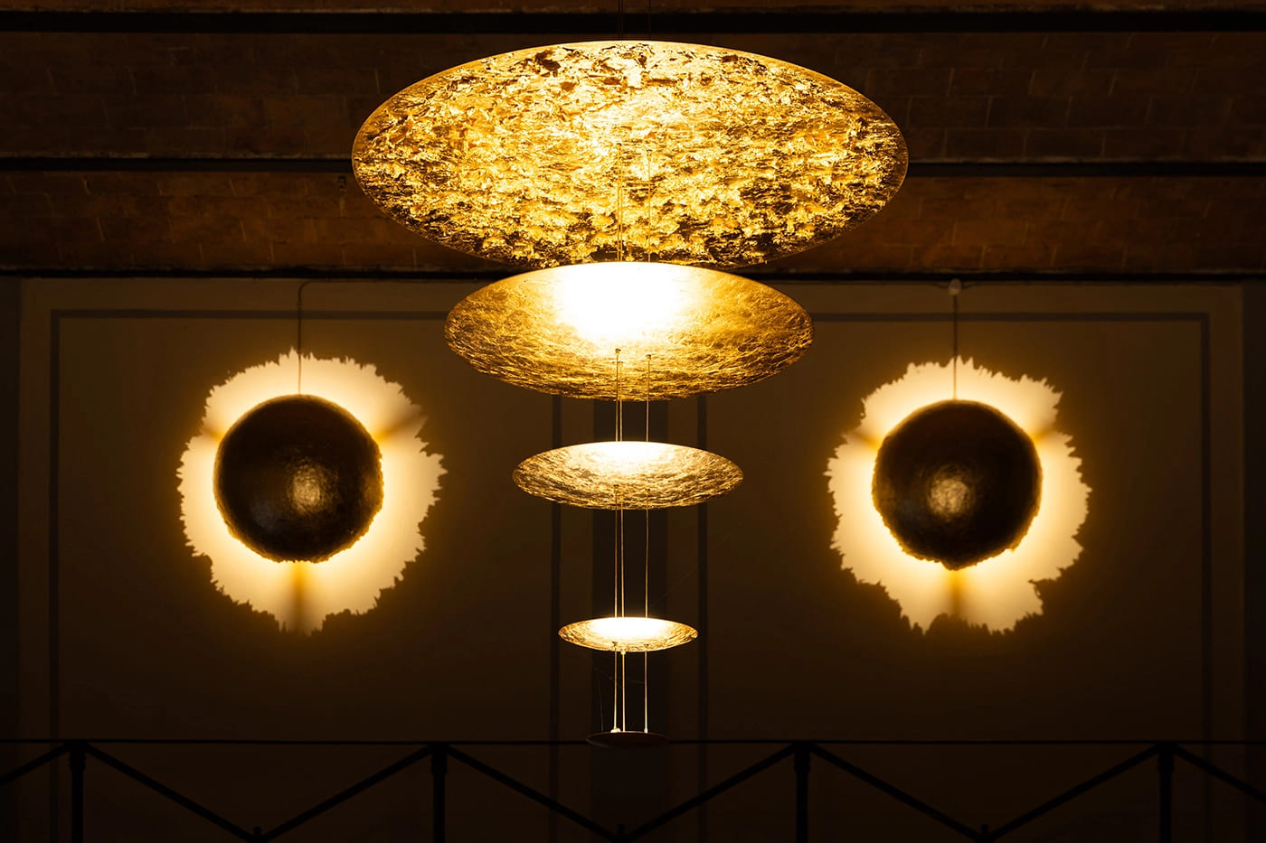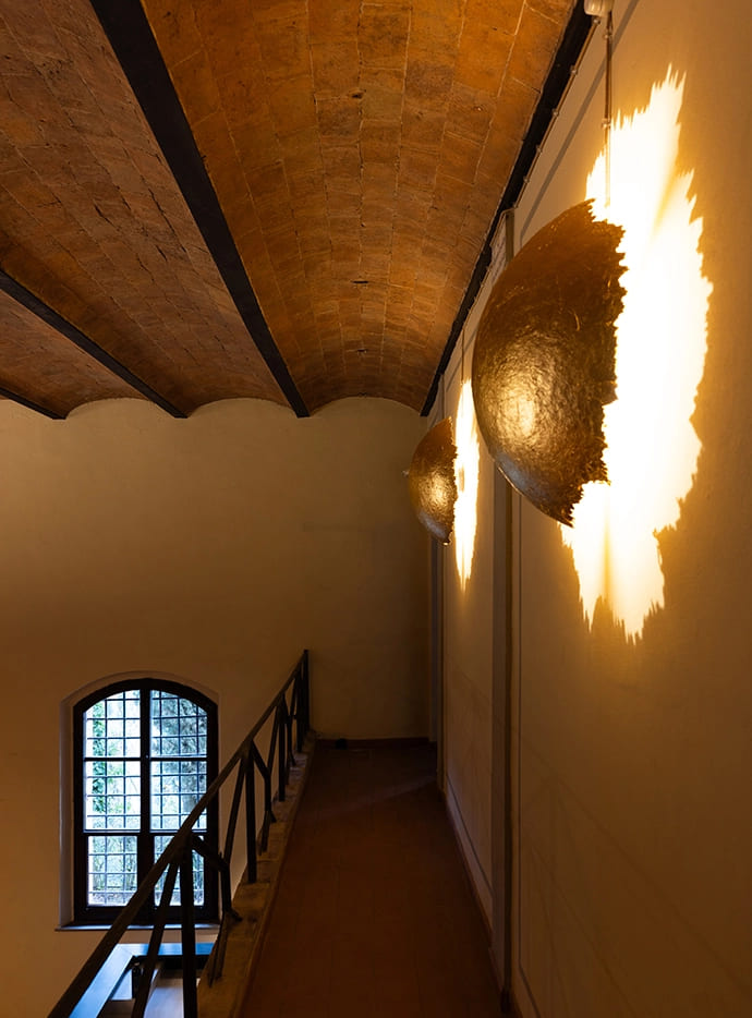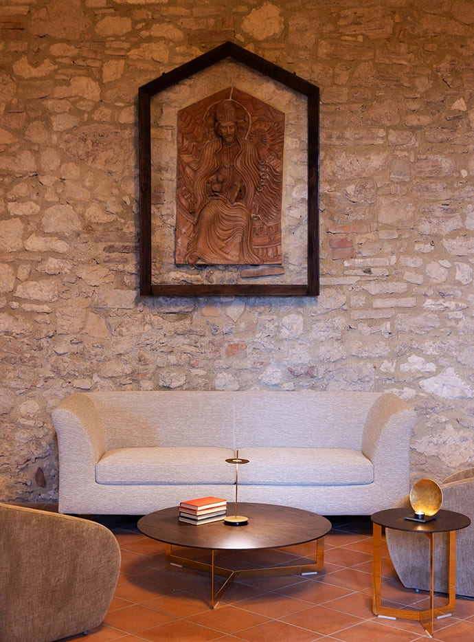 Lighting by Catellani & Smith plays a vital role in the design. Their sculptural fixtures do more than provide illumination; they engage with every surface. Light and shadow move across textures, revealing the depth of aged stone walls and the organic warmth of natural materials. This interplay creates a multi-dimensional, emotional atmosphere where every detail feels intentional. It is lighting that brings soul to the space, not just brightness.